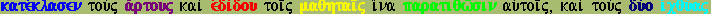 Taking the 5 loaves and the 2 fish, he looked up to heaven, praised and broke into pieces the loaves, and gave his students to set before them; and the 2 fish divided to all. |